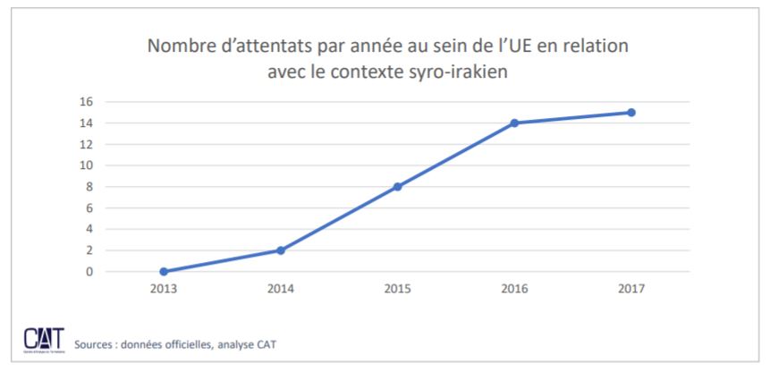 En outre, en 2017, le centre a recensé que dans 8 cas des attentats, les auteurs seraient des revenants de la Syrie.