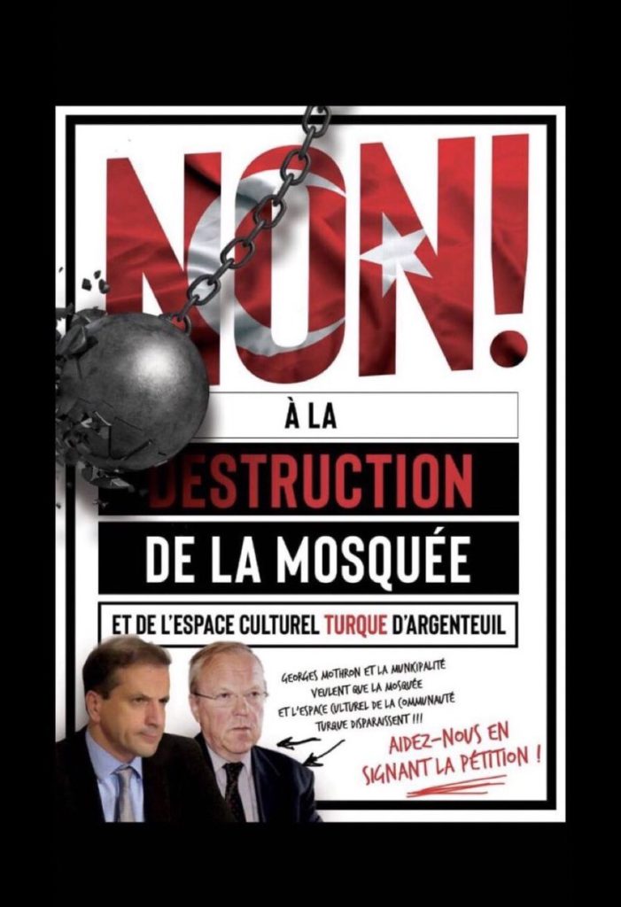 Une pétition lancée par l’Association Mevlana à Argenteuil (Vald d’Oise près de Paris), demande au maire Georges Mothron et son adjoint Gilles Savry de faire cesser l’acharnement contre la mosquée et l’espace culturel de la communauté turque qui risque de disparaître.