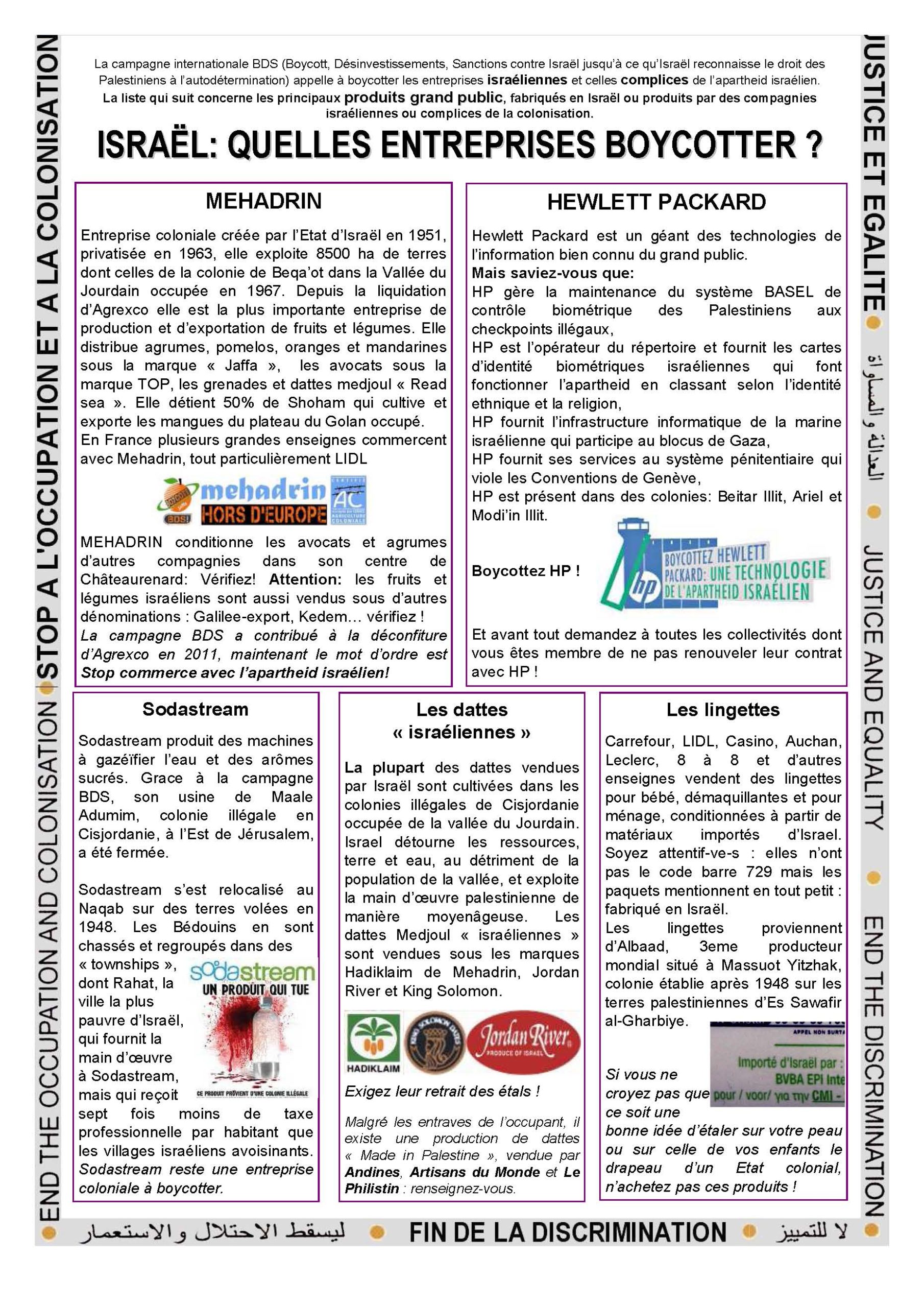 Nous boycottons tous les produits israéliens (les fruits et légumes Mehadrin, Orri, Jaffa, les dattes medjoul, les médicaments Teva, la machine et les consommables Sodastream, l’épilateur epilady, les contenants en plastique, meubles de jardin et caisses à outil Keter, curver, allibert, les lingettes marques distributeurs, etc) et quelques cibles soigneusement sélectionnées par le BDS Palestinien.