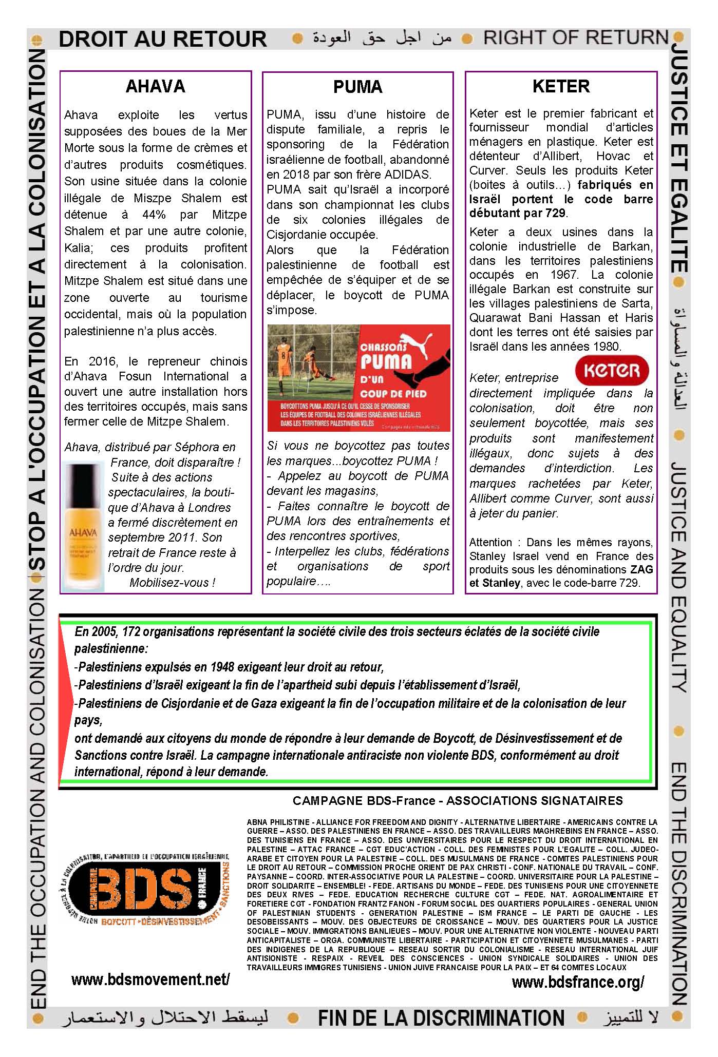 A la dernière journée nationale d’actions contre Puma, il y a eu aussi des actions de boycott en France, en Allemagne, en Italie, en Espagne, au Japon, etc. Ce qui est efficace c’est d’avoir un nombre réduit de cibles et de boycotter les mêmes marques TOUS en même temps ! En respectant évidemment les directives palestiniennes